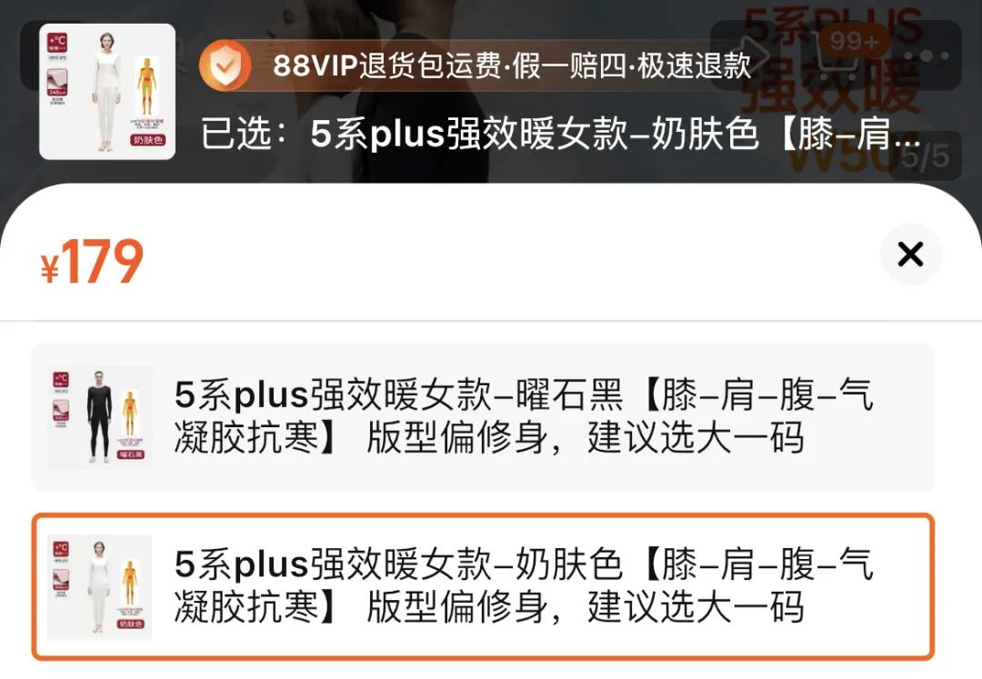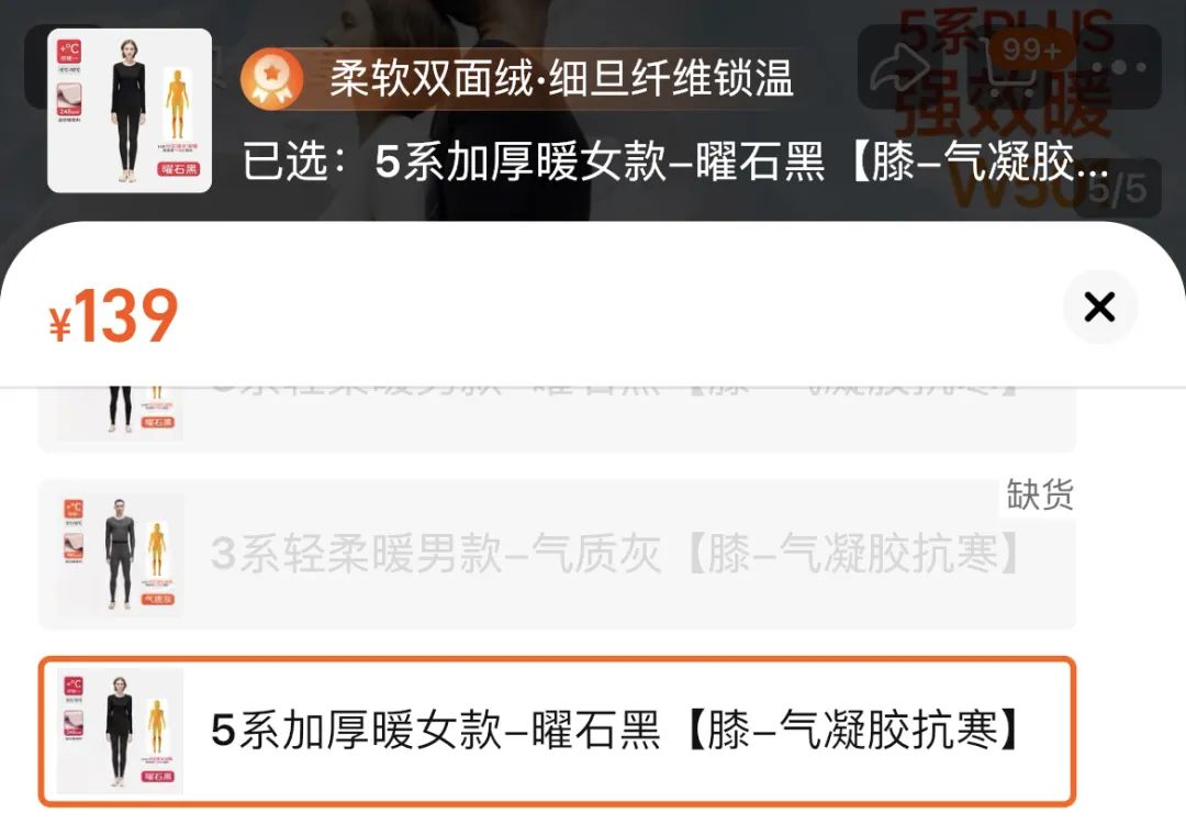 旗舰店1套5系中厚素湃保暖内衣要139元,5系加厚要179元。