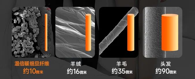 用的是温倍暖细旦纤维,比传统纤维细10倍以上,比蚕丝纤维细41.2%,比山羊绒细34.5%。
