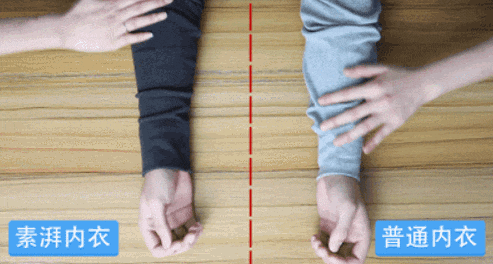 把左右胳膊分别穿上普通保暖衣和素湃保暖衣,相同力道摩擦一分钟左右,观察胳膊的温度变化。