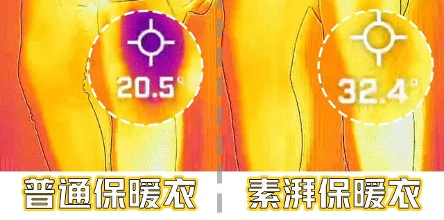 用温感仪测试后发现:穿普通保暖衣的膝盖处温度降到20.5℃;而穿素湃保暖衣的膝盖处温度是32.4℃,仅仅降了不到1℃!