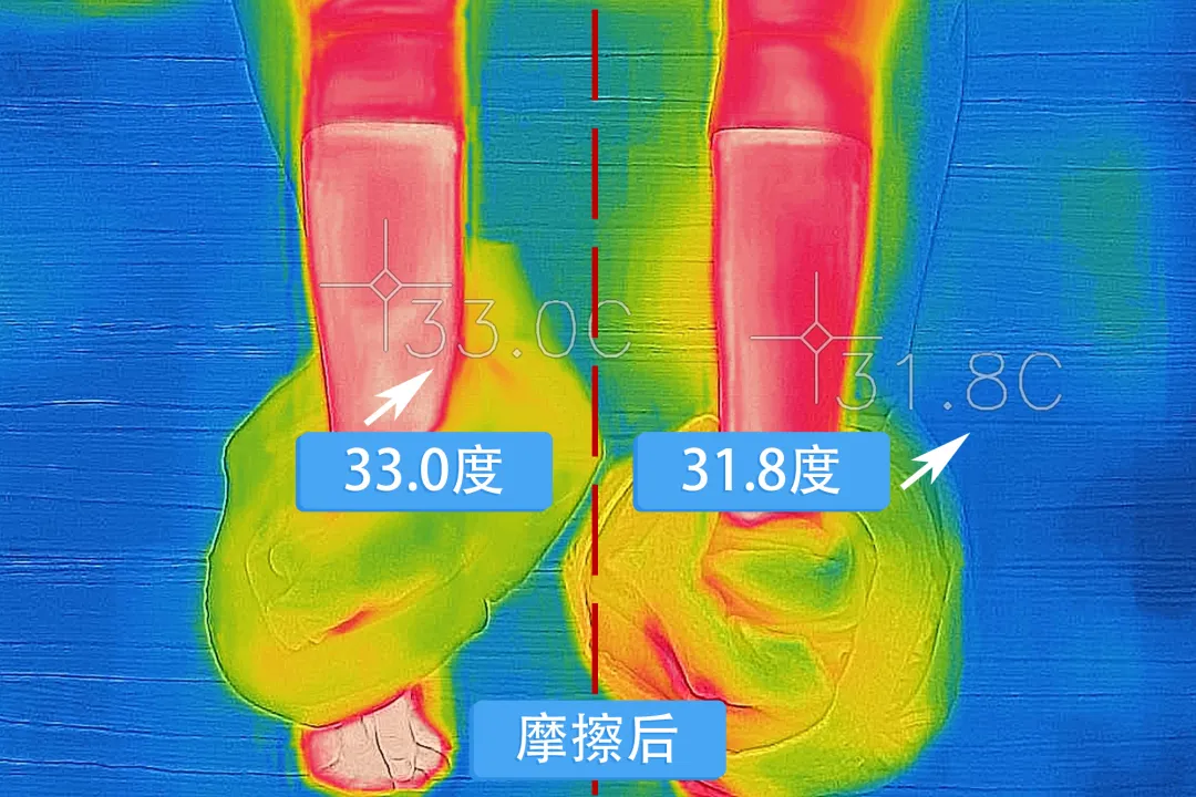 普通保暖衣摩擦后胳膊温度只要31.8℃;素湃保暖衣摩擦后,胳膊温度直接上升到33.0℃!