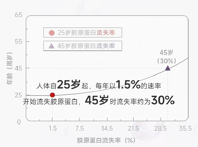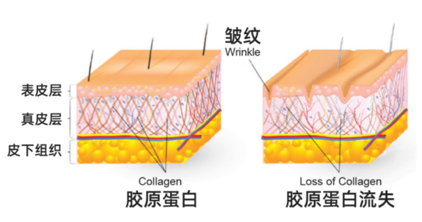 胶原蛋白是人体中含量最多的蛋白质,约占人体蛋白总量的30-40%,广泛存在于皮肤、骨骼、眼睛、肌腱等部位中。胶原蛋白是真皮层的支柱,胶原蛋白流失会导致出现皱纹、面部塌陷。