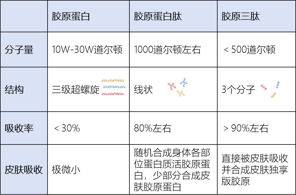 对比三者的结构就会发现,胶原蛋白需切割成小分子才能被吸收。