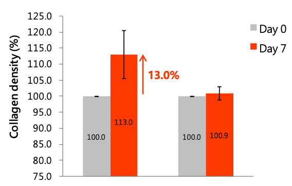 连续饮用NYO3胶原三肽7天后,可增加皮肤胶原密度13.0%,促胶原增生功效优于一般