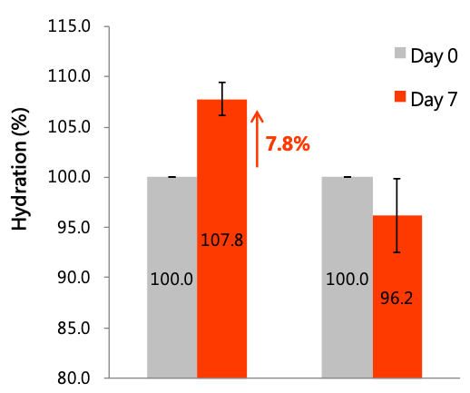 连续饮用NYO3胶原三肽7天后,可提升皮肤含水量7.8%,获得改善人数达100%,肌肤保湿功效优于一般胶原组