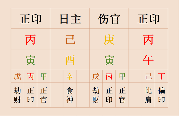 天干双丙正印透出,通根于年支帝旺午火、月时长生寅木,形成 “印星鼎盛”之局。地支双寅正官与年支午火半合火局,官印相生,气势连贯。