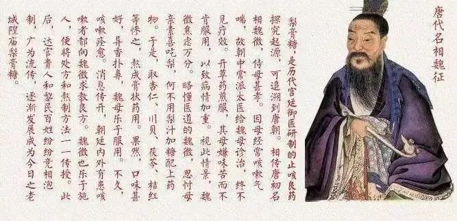 据说,魏征母亲患有咳疾,久病不愈却不肯服药,母亲喜欢吃梨,略懂医道的魏征就“以梨汁与百草为伍,煮之,味纯润肺”。数日,母亲见愈。这就是早期的“宫廷古方梨膏糖”。
