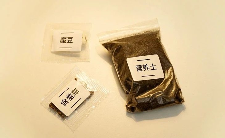 除了拼板,还有一个纸盒,里面是三个独立包装袋,分别装着营养土、含羞草种子和魔豆的种子。此外,还有一个透明的塑料种植槽,用于盛放营养土。