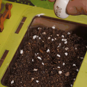 娃将营养土小心翼翼地倾倒在小槽里,还仔细地用小手把泥土铺平。接下来,就是放种子了。魔豆和含羞草,这两种植物听上去都好有意思呀!小家伙犹豫再三,最后选择了先种魔豆。