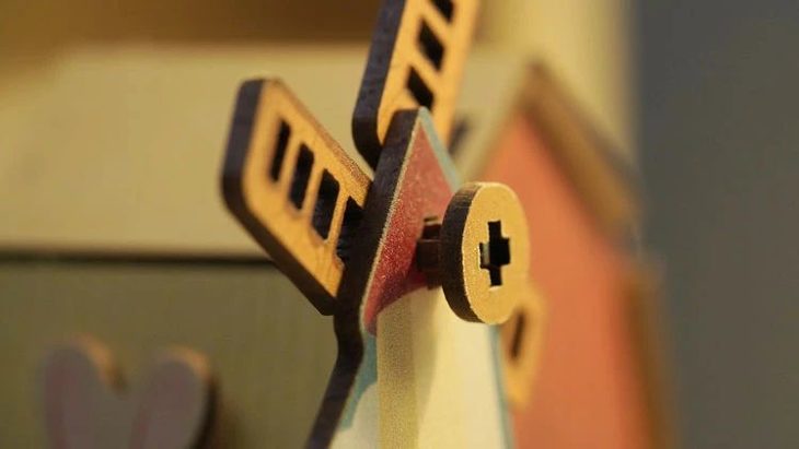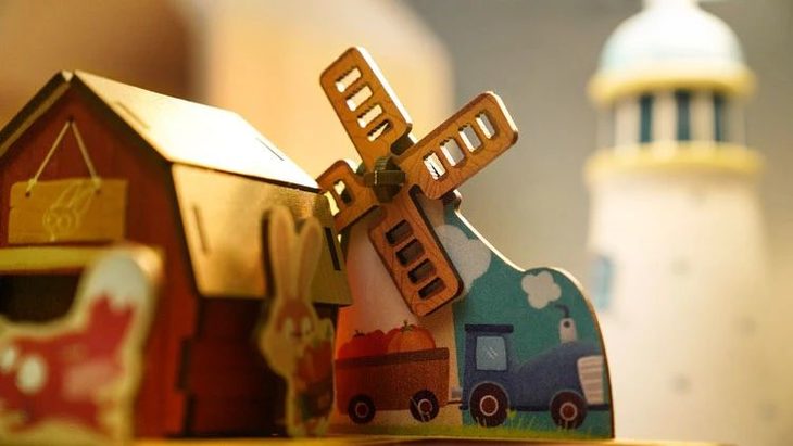 我不禁会心一笑,嘿嘿,其实我也是这么认为的呢!这款玩具搭好之后的颜值真是没话说:小狐狸、小兔子的卡通形象萌趣可爱;木质小屋、风车的立体造型充满童话气息;鹅黄、明橙、草绿、粉红、亮蓝的配色温暖而明艳。再看它的细节,围墙上的细缝、风车上的叶片、屋顶上的棱角……每一处都刻画得细密而精致。