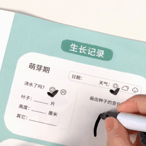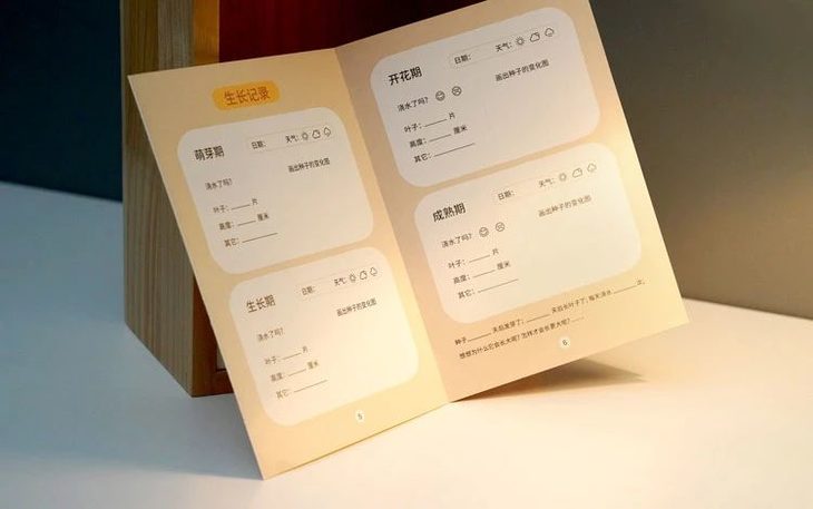 玩具里附赠了一本种子生长日记,里面除了提供种植方面的小知识与小贴士外,还设计了详细的生长记录表。从萌芽期、生长期、开花期一直到成熟期,这株植物的一切细节都可以被用心记录下来。