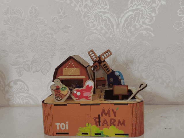 Wow~这座屋子非常牢固,它有着黄色的屋顶、红褐色的墙壁,屋后有一座随风旋转的风车,朝着它吹气或者用手拨一拨,真的可以动耶!风车底下有卡车,小狸和它的兔子朋友则在家门口抱着果蔬。整个房屋的构造完全模拟了真实的生活场景,真的是栩栩如生呢!