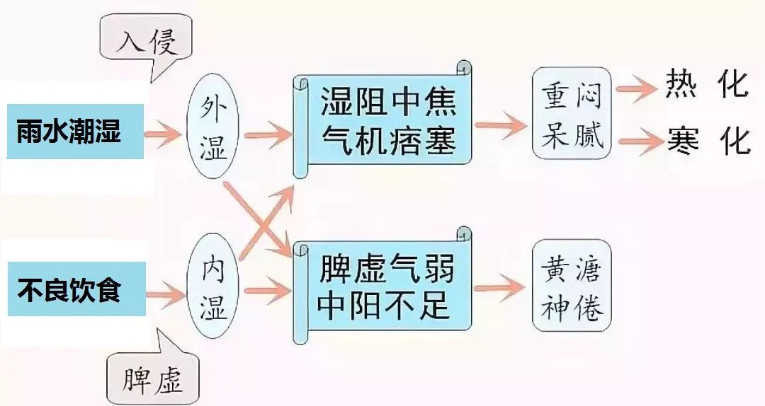 湿邪有内外之分,外湿多由气候潮湿,坐卧湿地而致病;内湿多因喜食冷饮,贪吃生冷瓜果等寒凉之物,损伤人体脾阳所致。