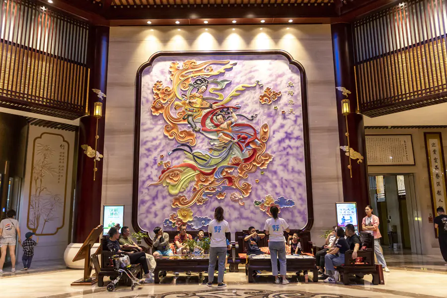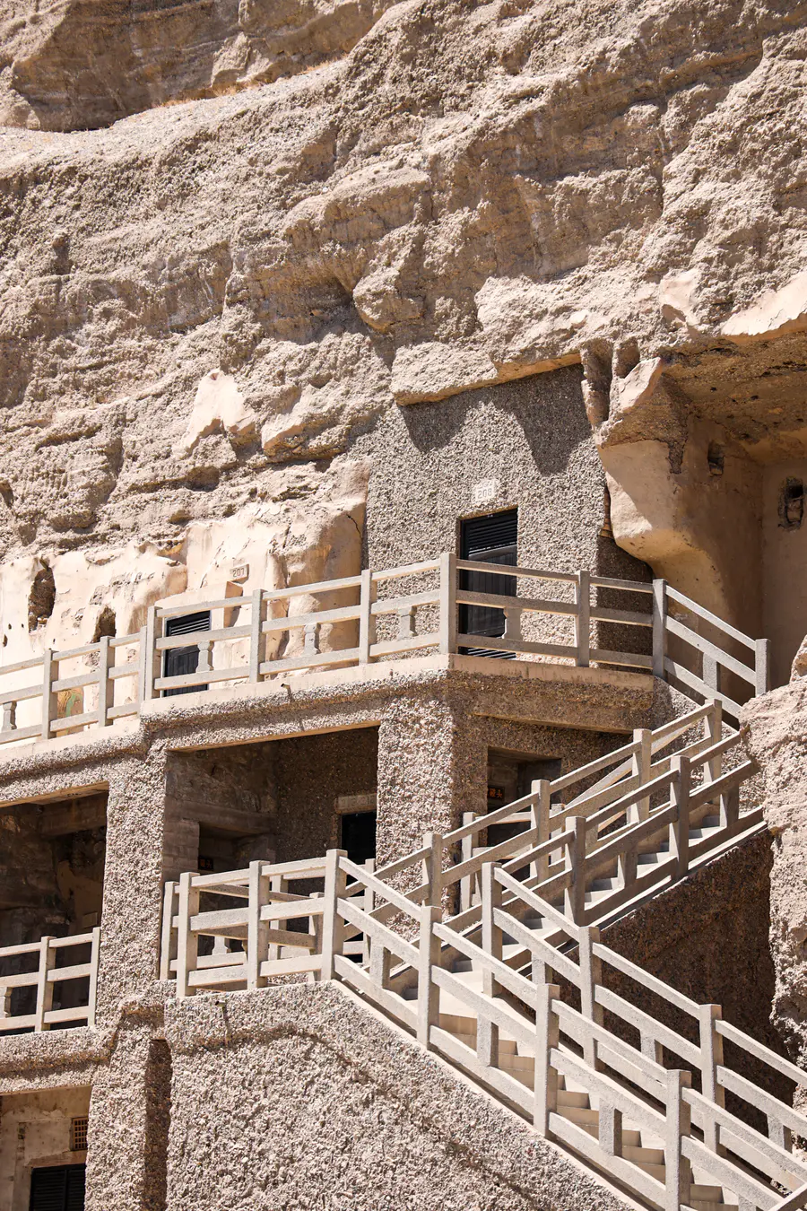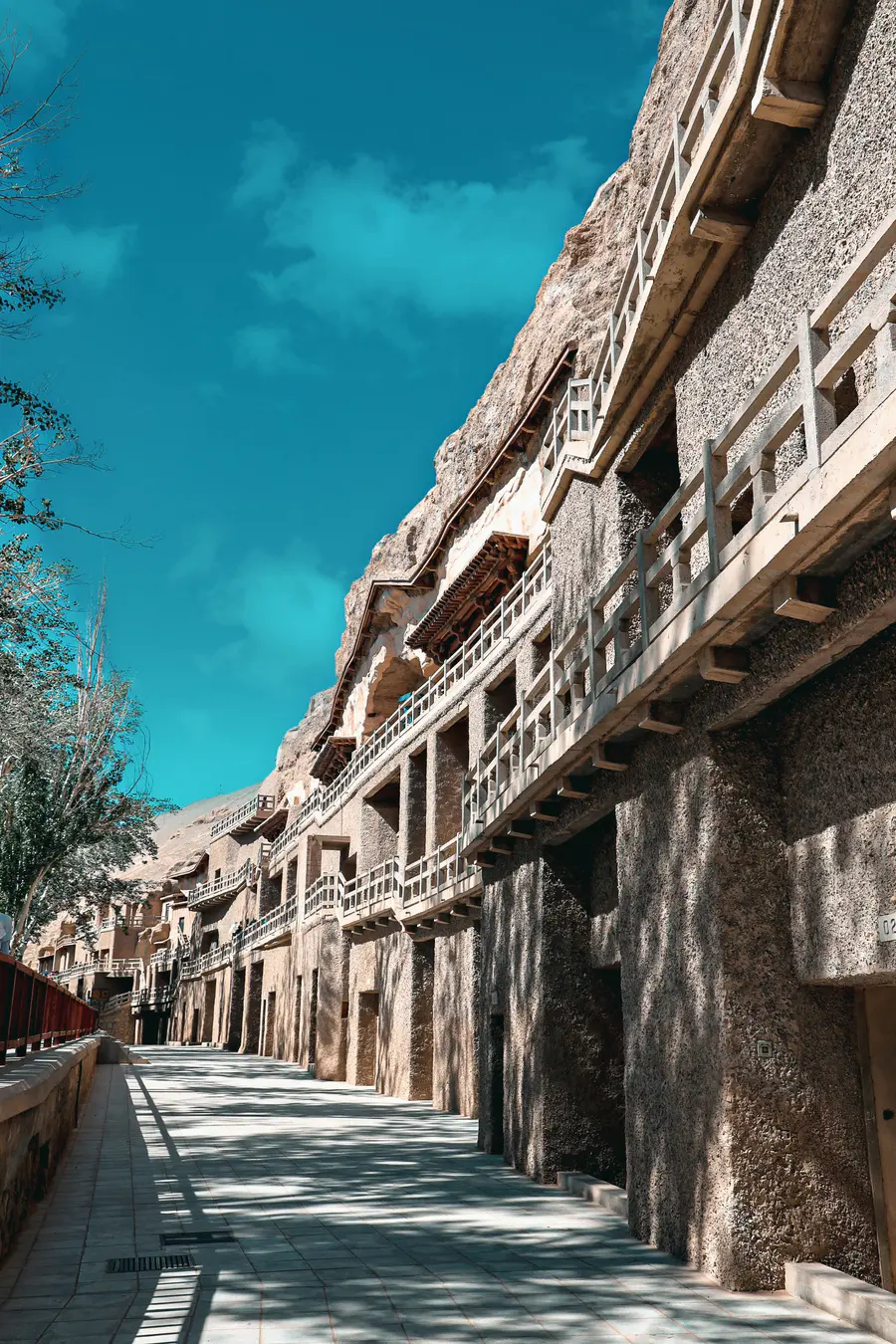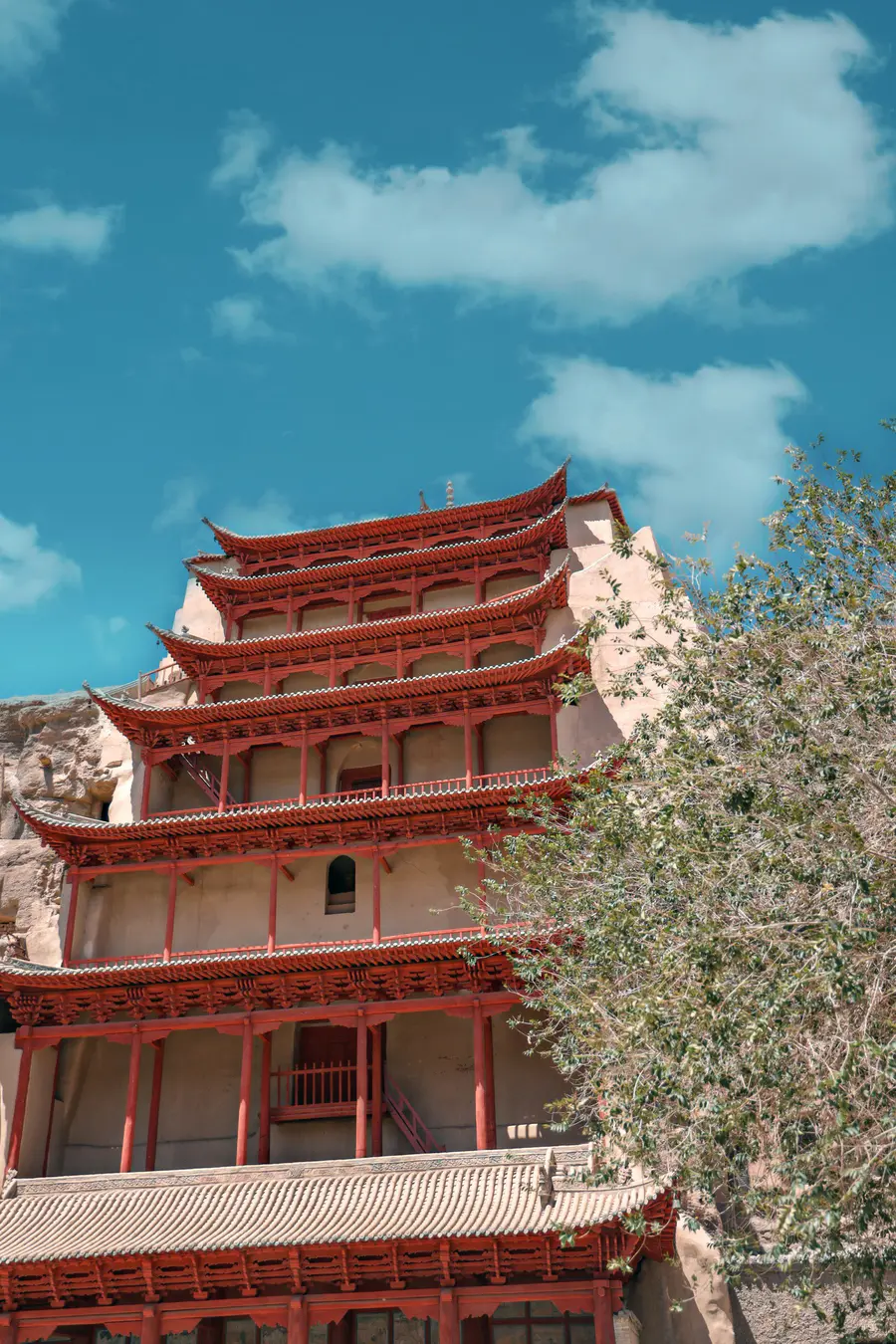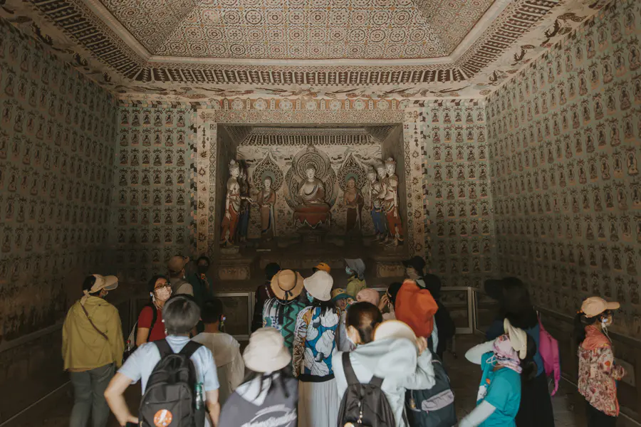 【下午】在了解完前情知识以后,我们会去往敦煌莫高窟,观看数字影像中心的主题电影,通过两部电影对莫高窟的历史有了初步了解后,由特约一级讲解员带领参观讲解莫高窟的佛窟与壁画。