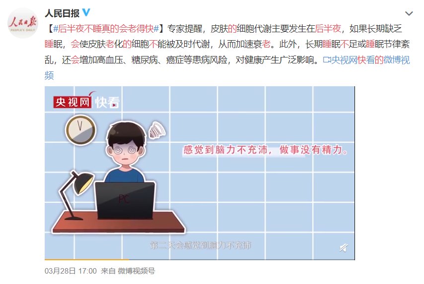 专家提醒,皮肤的细胞代谢主要发生在后半夜,如果长期缺乏睡眠,会使皮肤老化的细胞不能被及时代谢,从而加速衰老。此外,长期睡眠不足或睡眠节律紊乱,还会增加高血压、糖尿病、癌症等患病风险,对健康产生广泛影响。