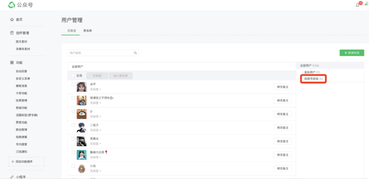 2、由于微信官方的限制,视频号只允许挂载“已经群发的公众号文章链接”,所以有赞会在商家微信公众号后台新增一个“视频号转链”的标签,商家朋友们不要往这个标签里添加用户或删除此标签,否则将导致生成链接失败。
