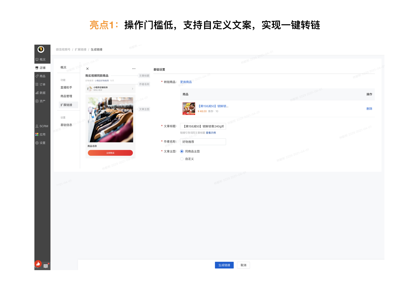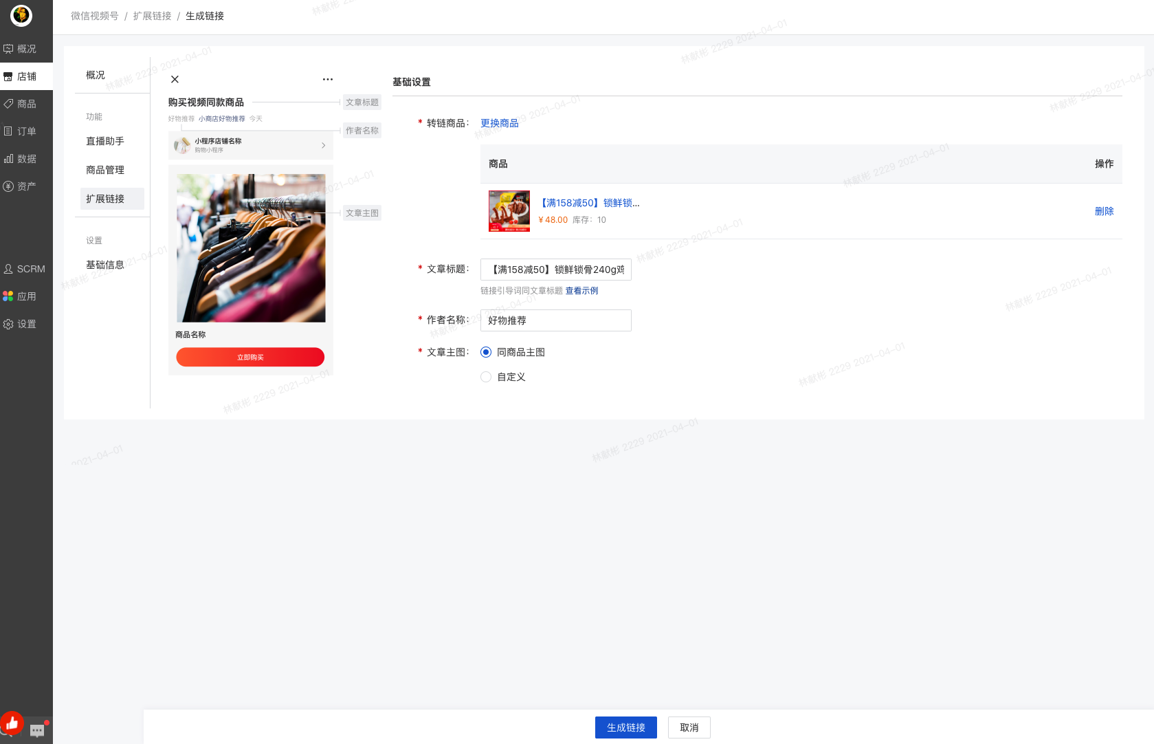 注:自定义上传商品主图时,大小不能超过1M(大小是微信官方限制);如果取的是默认商品主图,会自动取该商品主图的第一张,可能会出现大于1M的情况,这个时候会转链失败,请更换商品主图到1M内或者使用自定义图片。