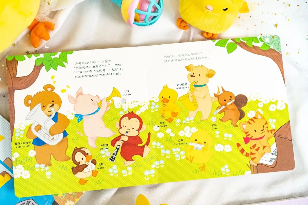 《一起来演奏》这本的故事内核则非常暖心:讲述了小鸡球球与好朋友们一起,为庆祝敬老节而苦练乐器,只想给爷爷奶奶带来一场充满爱的表演……