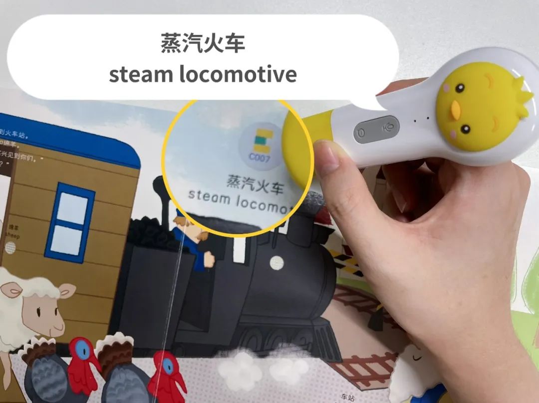 “内容贴”则是对应着发声书中的82个认知点。比如点读“蒸汽火车”,会朗读一遍中文“蒸汽火车”,再读一遍英文“steam locomotive”,接着还会发出蒸汽火车的轰隆隆、呜呜声……