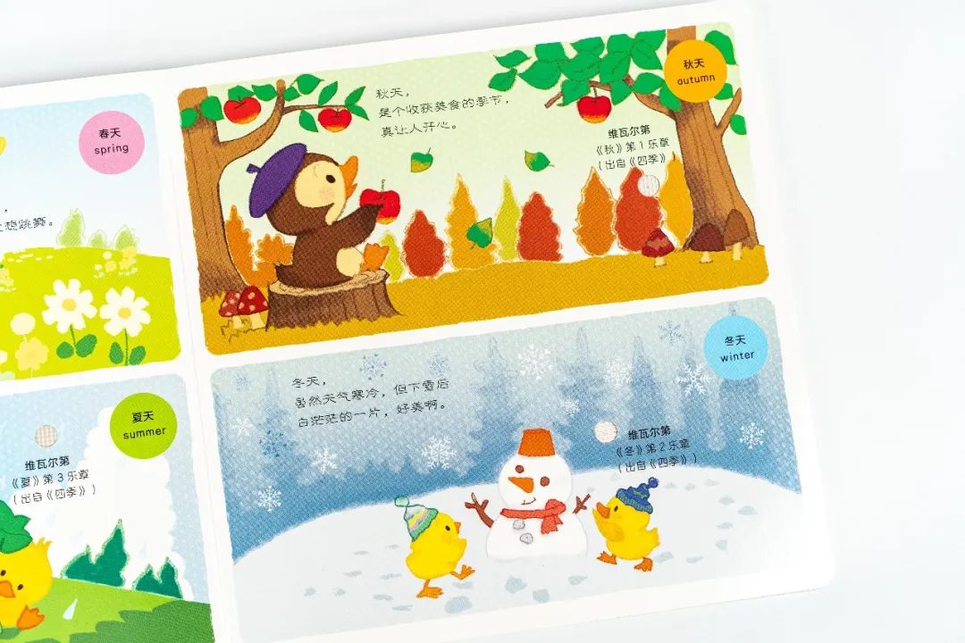 通过场景感很强的插图,引导宝宝感受春夏秋冬的季节特点。