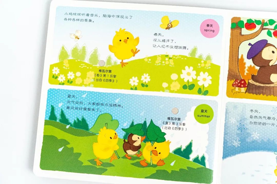 比如聆听维瓦尔第的《四季》,《春》的乐章欢快舒展,让小鸡球球想起在繁花盛放的春天跳舞的欢乐时刻;