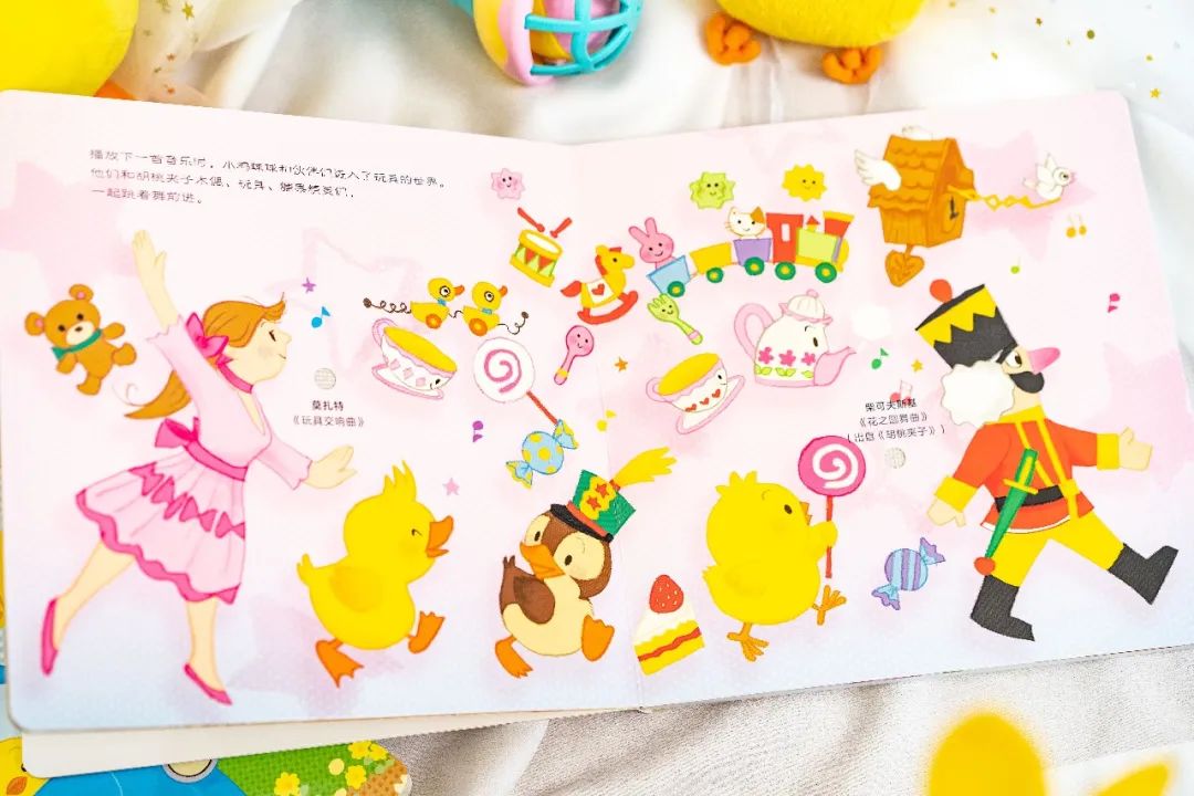 而在聆听莫扎特的《玩具交响曲》和柴可夫斯基的《花之圆舞曲》时,小鸡球球和它的好朋友们仿佛进入了奇妙的玩具世界!欢乐的氛围感小朋友们一下子就能get到!