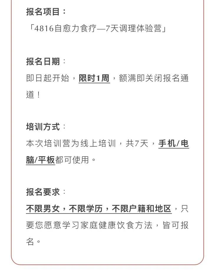 ♦️更适合中国人的饮食习惯:本次体验营是根据国人的身体情况、饮食和养生习惯,并结合了营养科学与中医,打磨成的一套更适合国人的饮食营养体系;