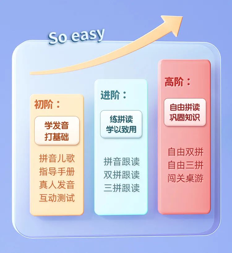 从基础学发音,到简单拼读,再到复杂的双拼、三拼、自由拼读,循序渐进,一站式打好拼音基础!