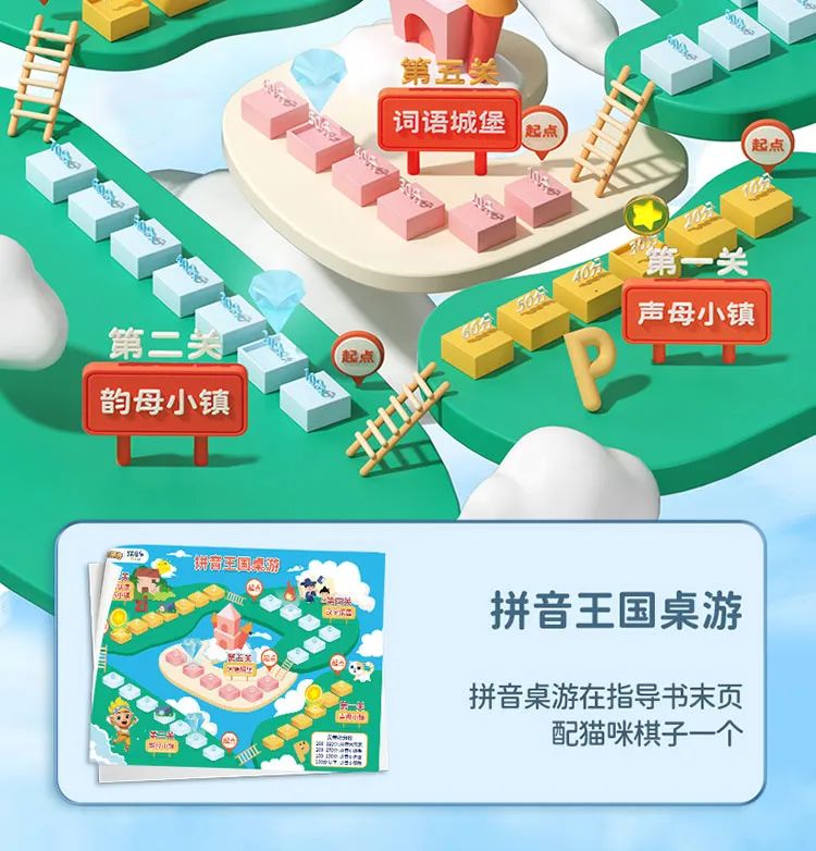 跟读练习上几遍,孩子对拼音的发音,声调,拼读的基本方法都会相应地掌握了解,再结合赠送的拼音桌游,5大关卡趣味互动,一边玩一边就能巩固拼音拼读能力,轻松解决家长的难题,强烈建议有需求的家庭一定要入手一个!