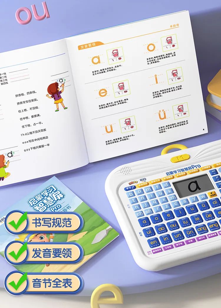 市面上一些仿版拼音机只有让孩子跟读的功能,毫无学习规律和体系,洪恩启蒙学习智慧屏Pro还同步配套了指导手册,辅导书写和发音规律,相信孩子很快就能把拼音知识点吃透了!