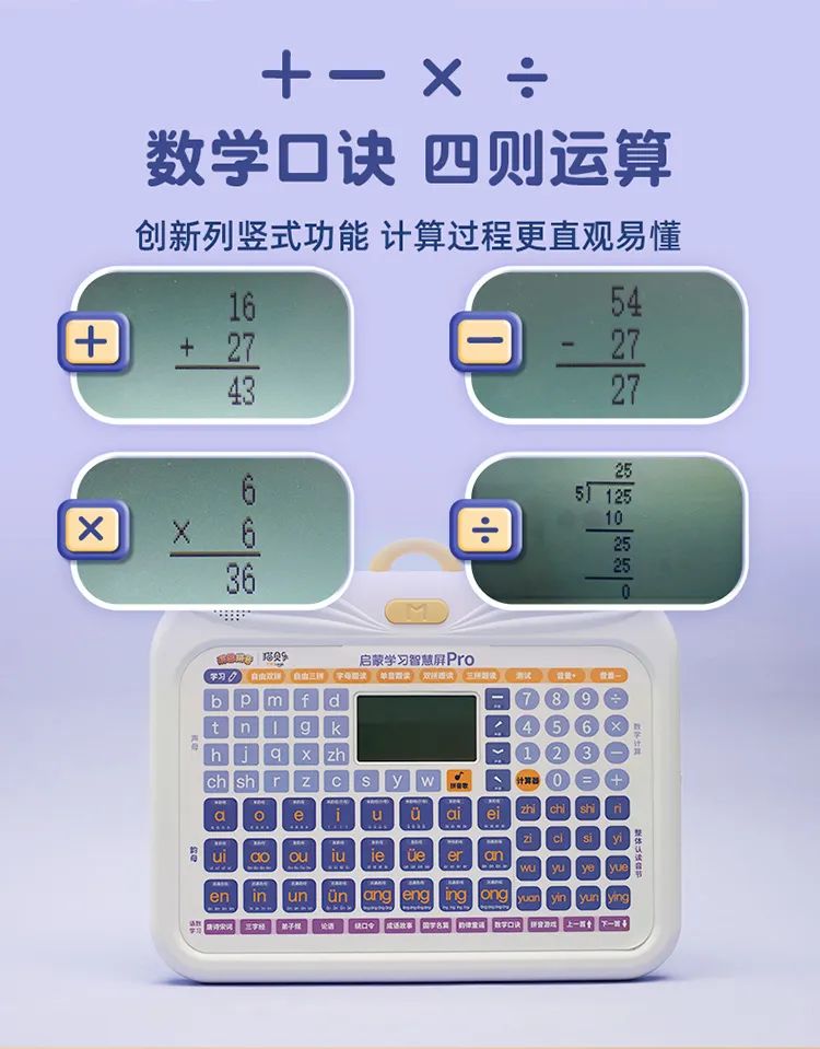 全新洪恩X猫贝乐启蒙学习智慧屏Pro多功能拼音机用了3.5英寸无蓝光护眼大屏,可以在拼读过程中区分声、介、韵母高清展示,也可以诗词逐字逐句展示,还能展示加减竖式运算,字大、清晰、好用,宝贝一点儿也不费眼!