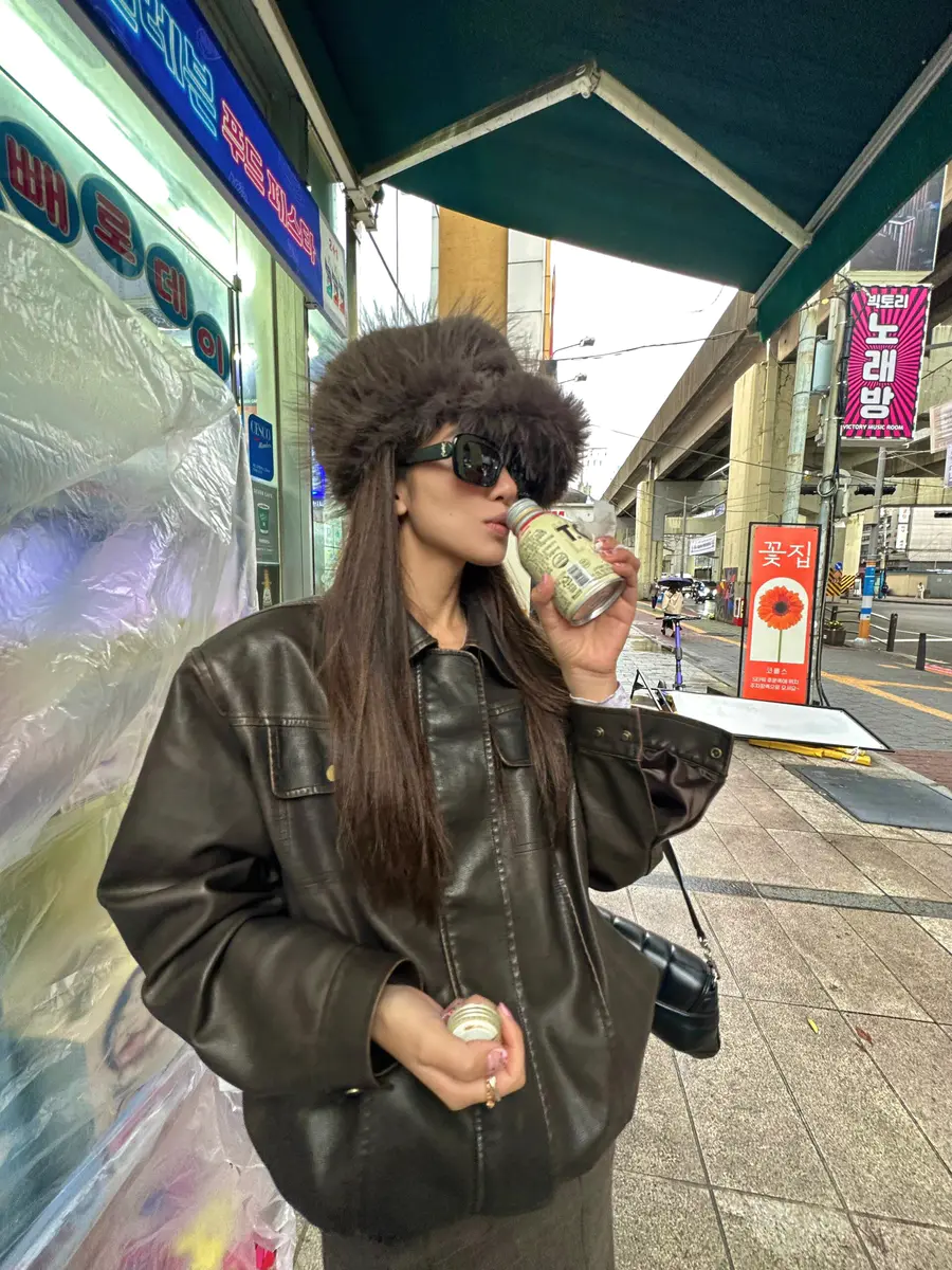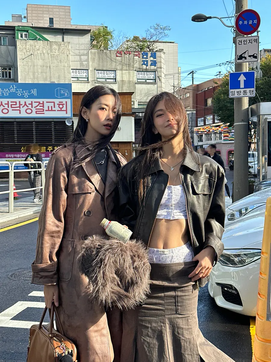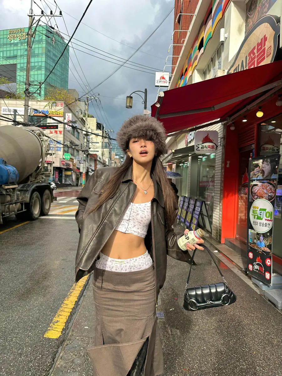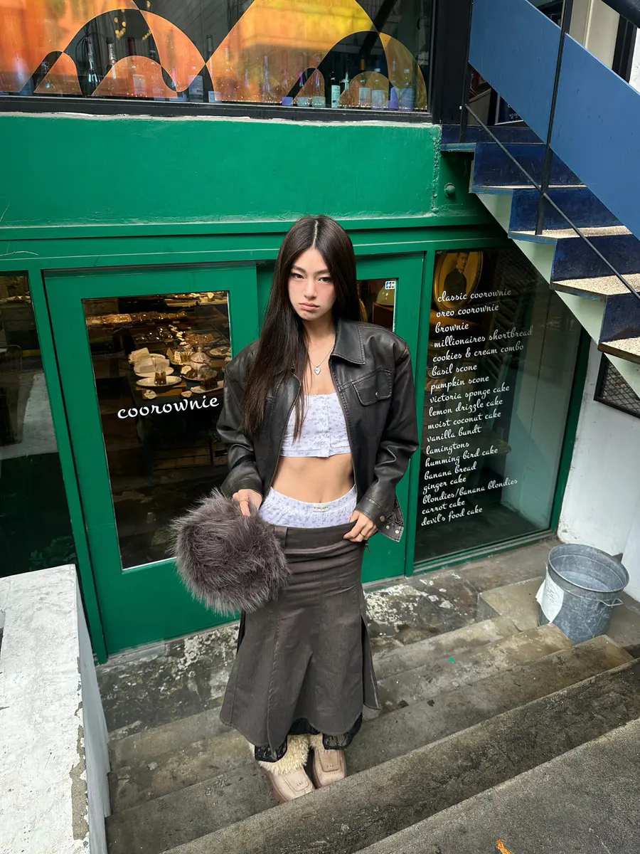 漫步首尔街头,🎄让擦色皮衣的复古光泽,与半身裙的柔美裙摆共舞。