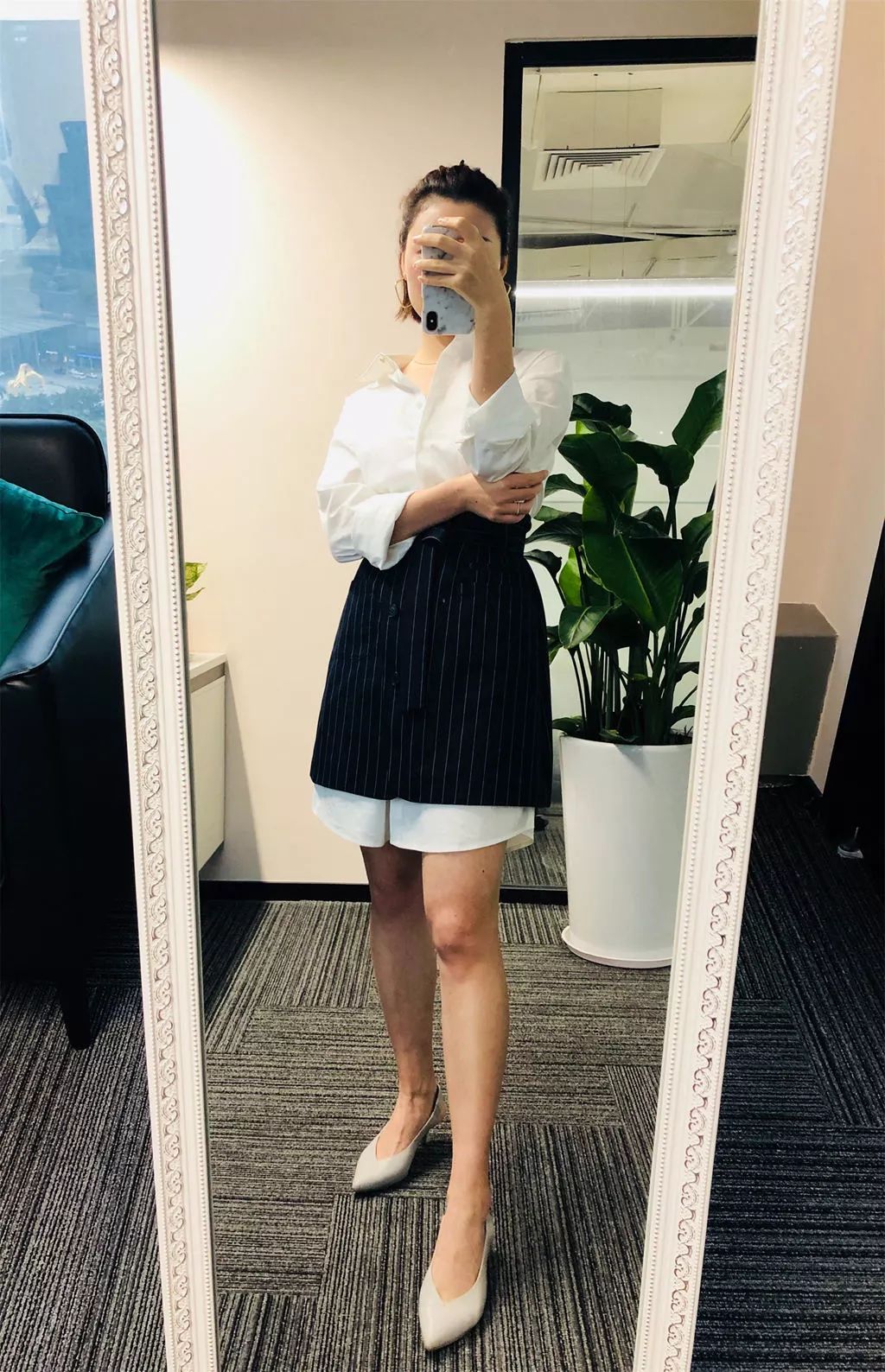 衬衫裙本身是模糊腰线的,挺括的西装裙却在强调腰线,叠穿的层次感反而显得人更修长了。