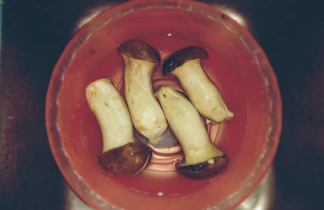 2、稍后会有出水,大火将水份蒸发掉,然后将菇煎至金黄;