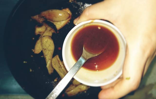 4、慢慢加入调料汁,让每片杏鲍菇均匀粘上汁,关火装盘。
