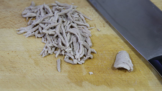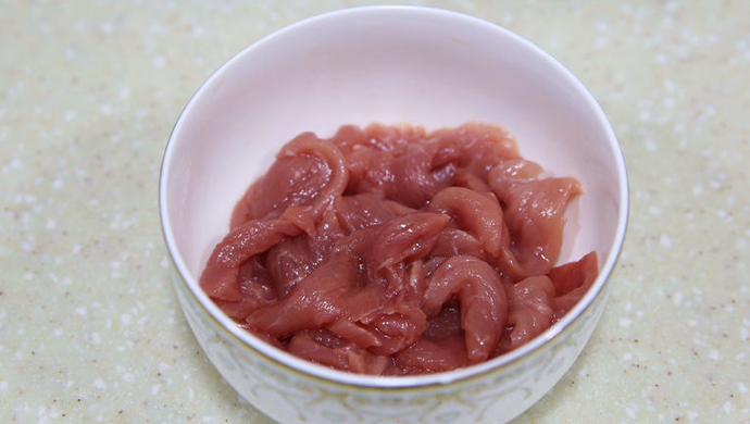 2、里脊肉洗净切片,加入1勺料酒(喝汤匙勺),半勺油,用手抓匀腌制15分钟;
