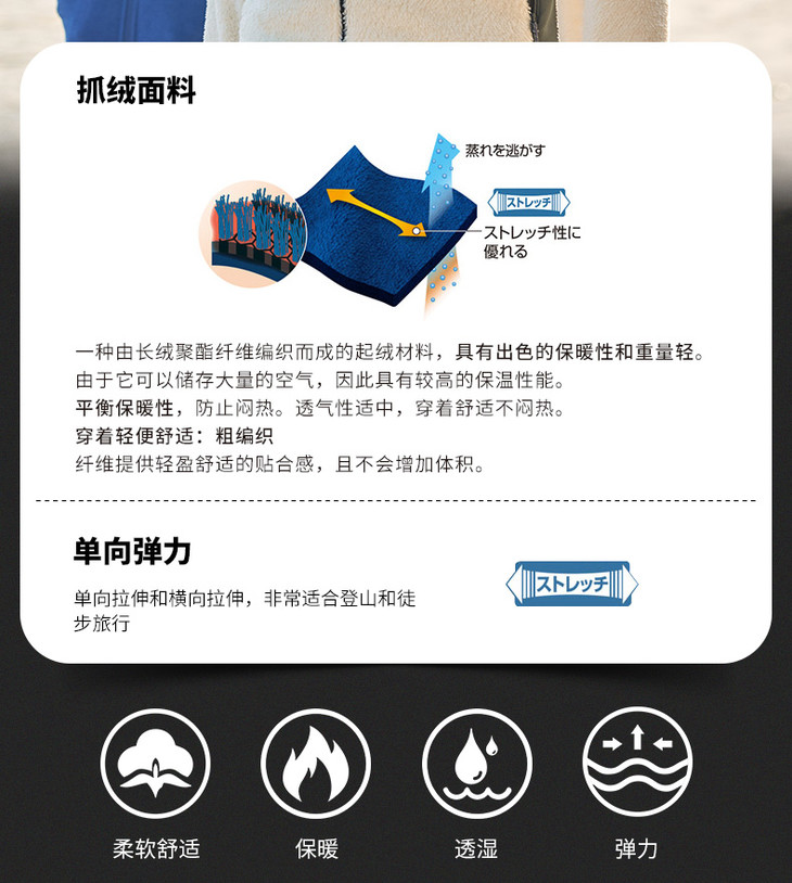 触感柔软/轻质保暖,这款抓绒外套,重量轻且具有良好的保温性、透气性,适度贴合身体,可作为秋季和冬季的中间层穿着。