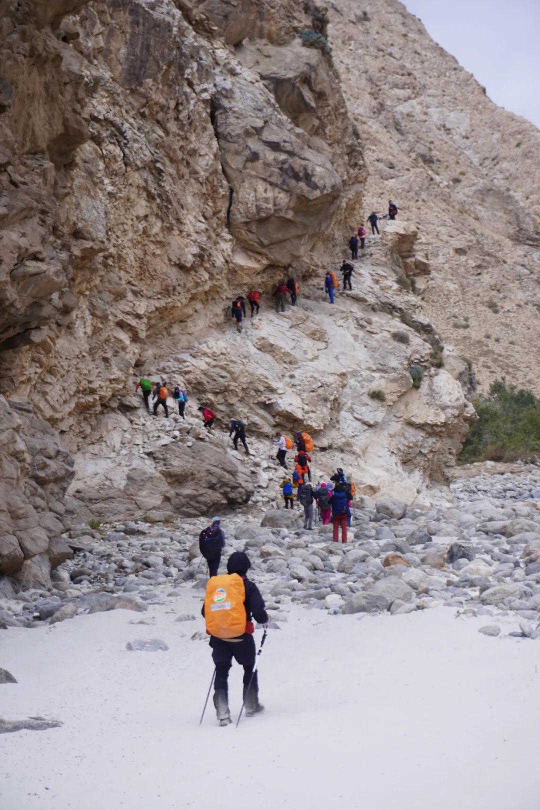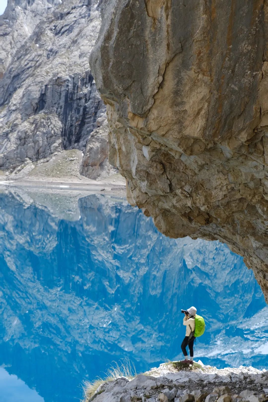 达坂之上,视野辽远开阔,一扫前两日峡谷中行走时的局促,天堂湖和远处的天山山脉山水相依,一派温情动人的景象。从达坂到天堂湖营地,是一条在垂直的岩壁上硬生生凿出的窄路,在传说中的“老虎口”处可以打卡天堂湖经典出片照。