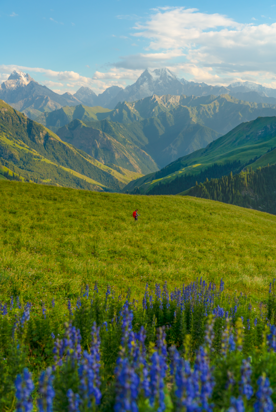 我可太爱北疆段了,太爱这一路随行的鲜花草甸和雪岭云杉!群山为幕,衬着湛蓝的天空、摇曳的云和绵延的草甸、绚烂的花,人如点墨,散落画卷之中。时而鹰飞风动,满世界的颜色开始舞蹈,让人的心也不自觉飘摇……