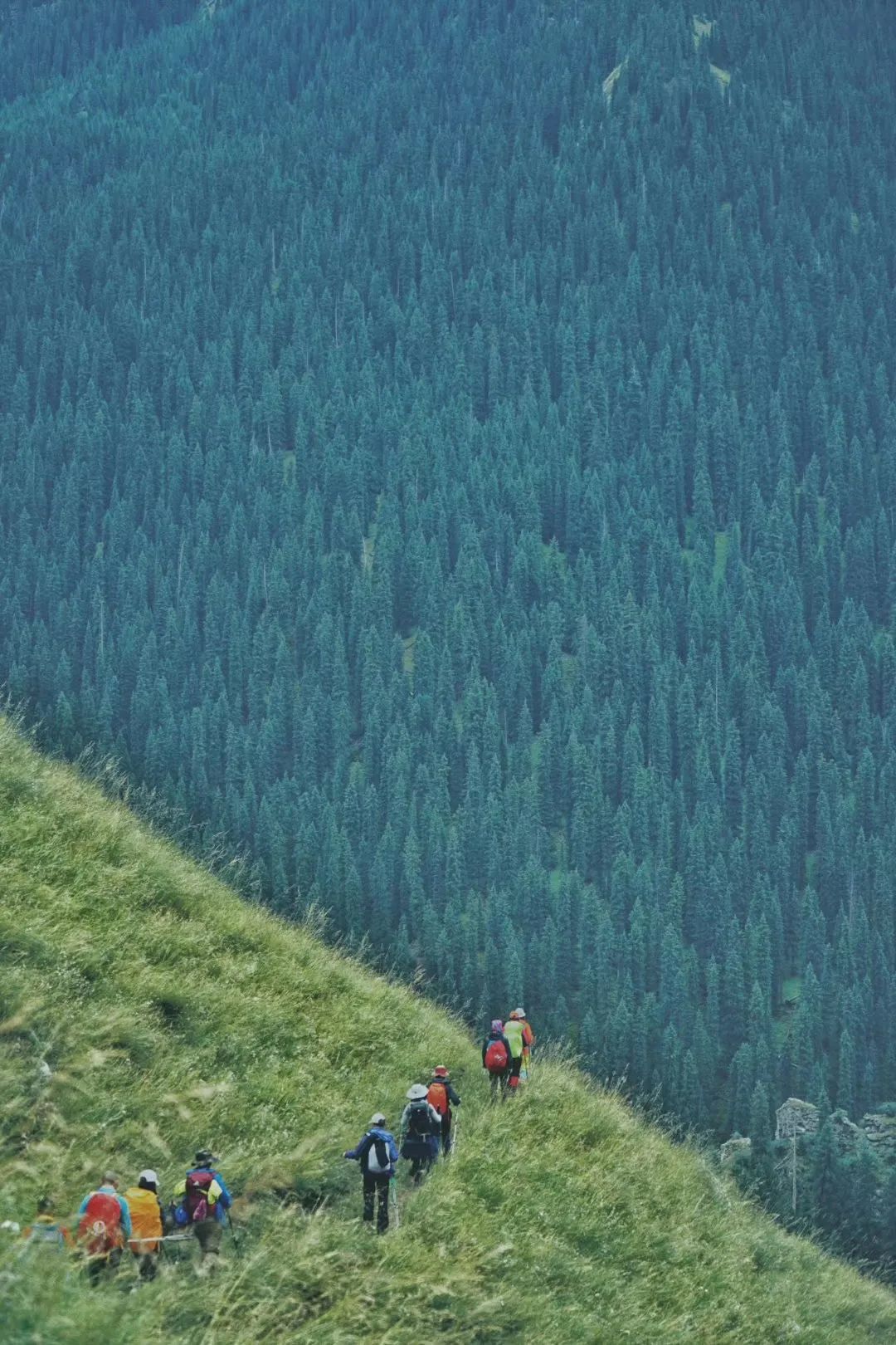过河和天堂湖是乌孙最强势的特征,但当天堂湖逐渐在身后隐退,每天的过河次数也不再给人强势冲击,天山深处的秘密开始袒露无遗——从落叶阔叶林到山地针叶林,再到高山草甸、碎石垭口、凛然雪峰,“垂直自然带”的定义在此立体而丰满。眼前的群山不似8000 米巨峰巍峨高耸,但棱角分明,以苍劲挺拔的墨绿色雪岭云杉披身,更显少年般的蓬勃朝气。把目光拉近,夏季,浓密的绿色草甸里,是被山中劲草守护的姹紫嫣红,沿着脚下被无数山友踩出来的狭长小径慢慢向上,路旁的花草似乎都在为我鼓掌。