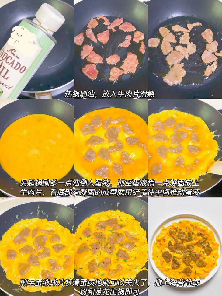 ❹另起锅放多一点的油,倒入蛋液,等蛋液中间成型凝固,放入牛肉片,看底部有蛋液成型就用铲子将蛋液往中间推,煎至蛋液成片状质地就可以关火啦