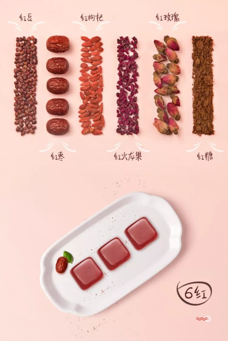控谷红糕集齐世间谷物六红:红豆,红枣,红枸杞,红玫瑰,红火龙果,红糖,萃取谷物美颜精华,每一种都大有来头。