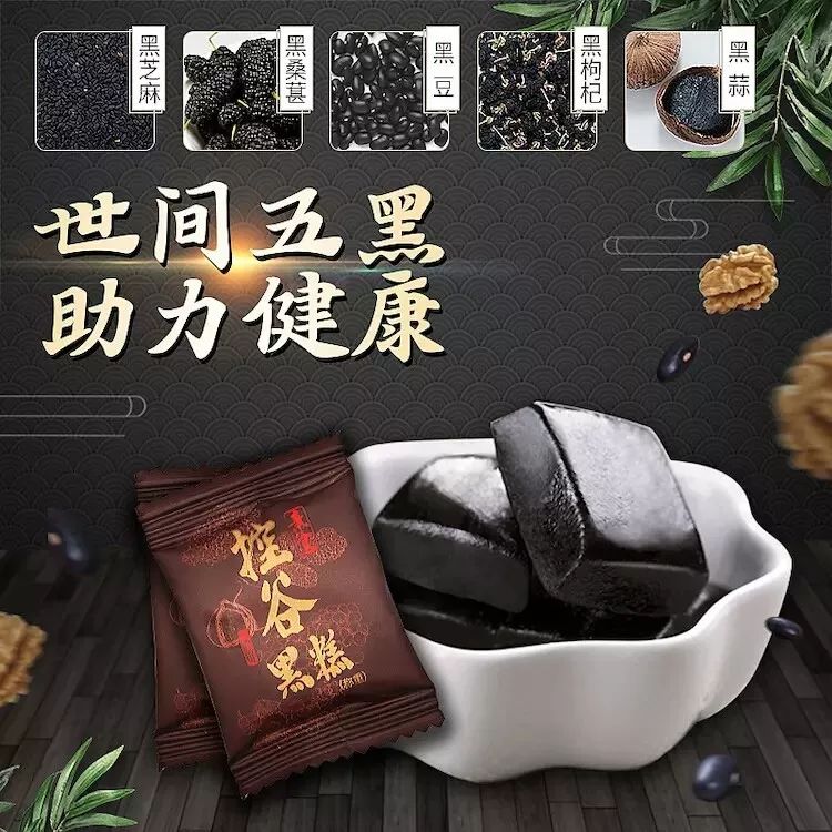 遵循中医的五行养生学,五色入五脏,黑色独入肾经。控谷黑糕以五黑:“黑芝麻、黑桑葚、黑豆、黑枸杞、黑蒜”和其他8种辅助食材为原料。