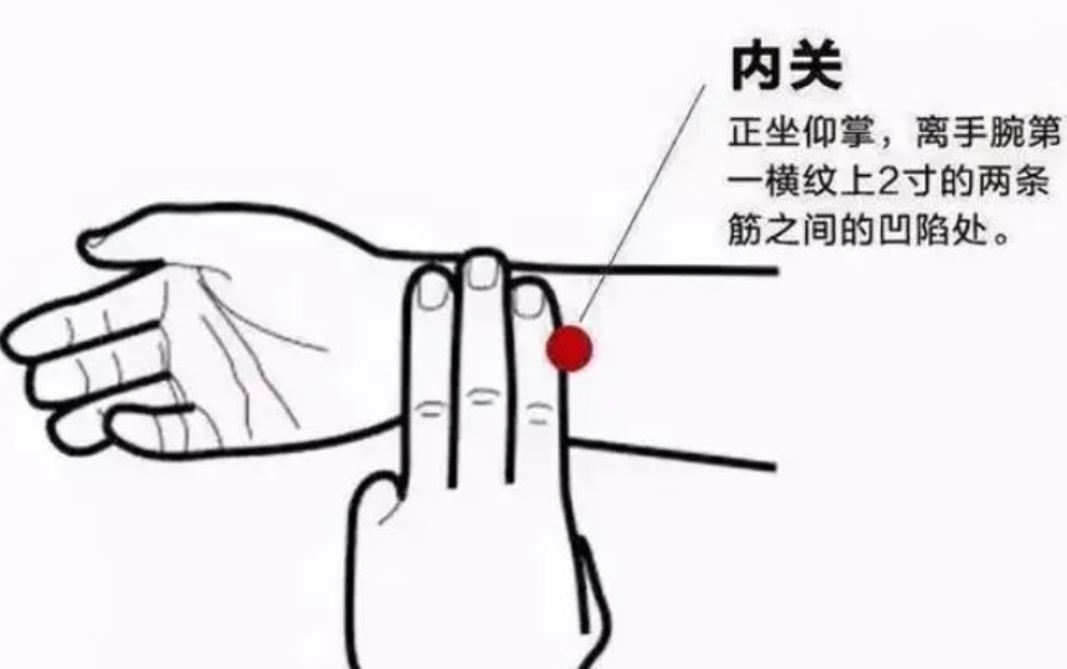 【位置】内关穴位于在人体的前臂掌侧,腕横纹中央向上2寸(大概3指)。