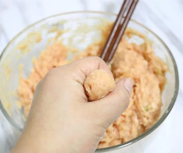 1、热锅凉油,油微微起烟后将大火调成中火,取出肉馅左手挤丸子;