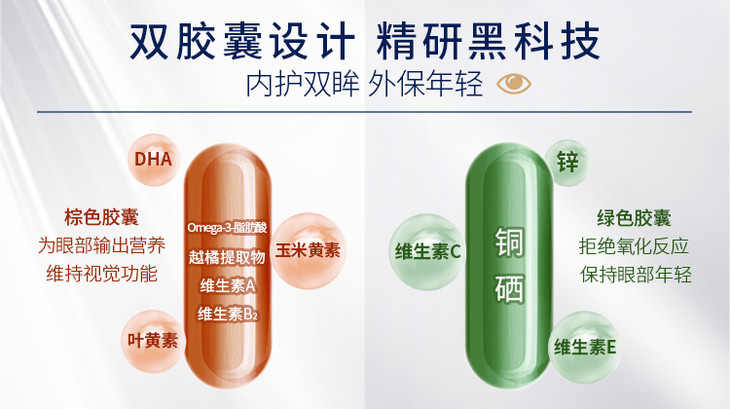 棕色胶囊添加护眼神器--叶黄素、光过滤器--玉米黄质、眼脑营养双供给--DHA、提高光敏感--VA、增加花青素--越橘提取物。