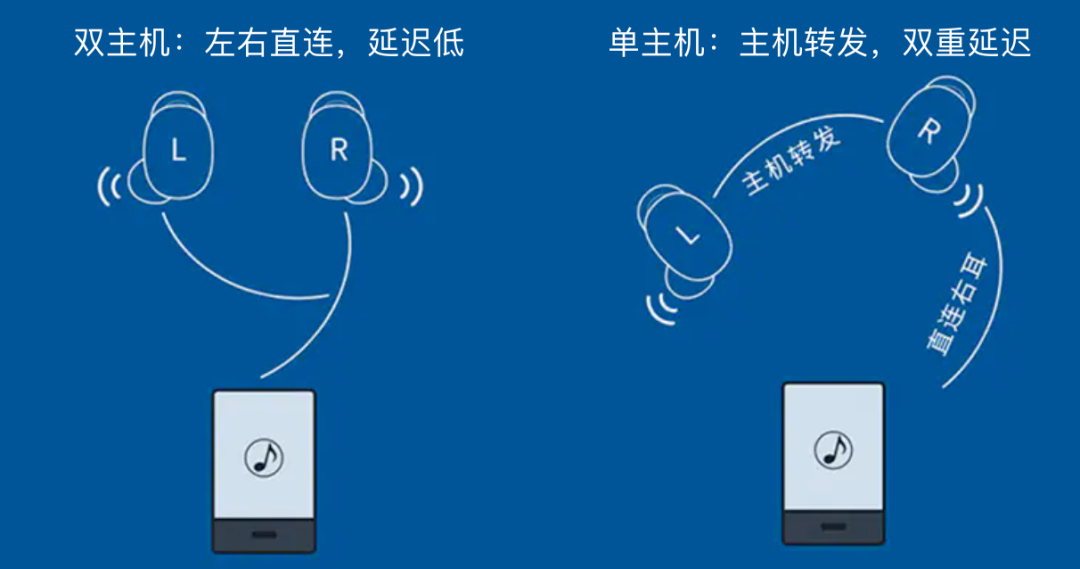 因为如果不是双主机,手机的信号发出,是先到主耳机,再到另一只,必定有延迟。