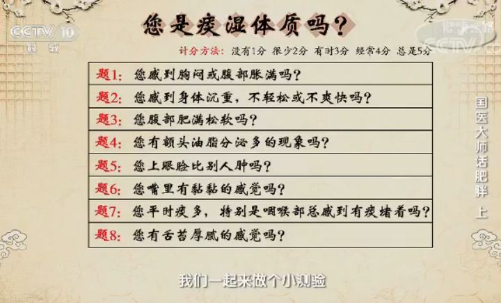 (计1分)、很少(计2分)、有时(计3分)、经常(计4分)、总是(计5分),8道题相加得分在21分以上就可以初步判断是痰湿体质。