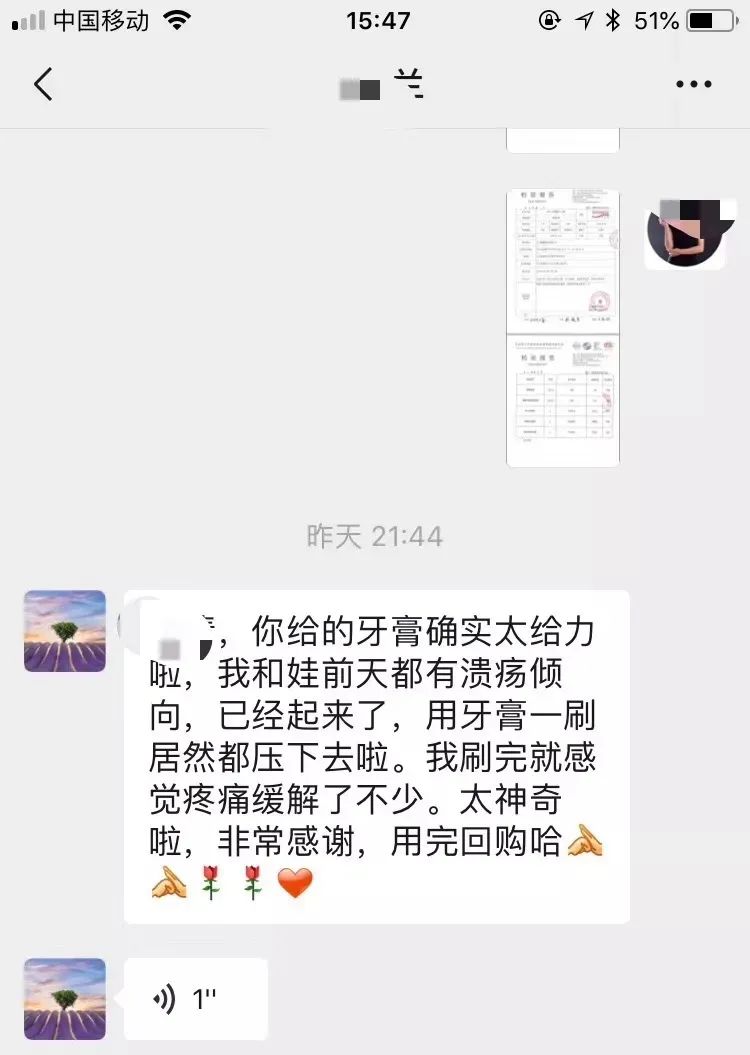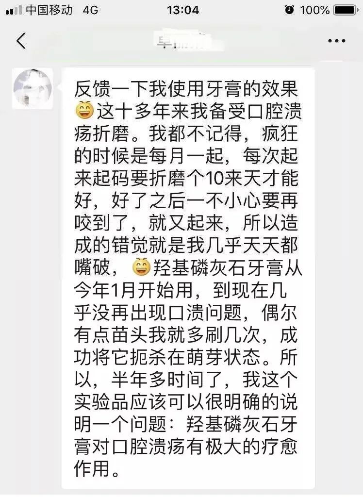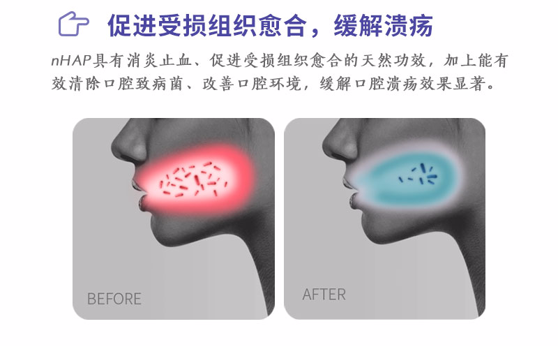nanoHAP牙膏能够物理粘附清除口腔有害菌,加上其消炎止血、促进伤口愈合的天然功效,因此能够有效防治口腔溃疡。以前中药铺将动物骨头磨成粉,涂在患者的伤口处,能够起到很好的消炎止血作用。nanoHAP牙膏,添加的是人工合成的骨粉,颗粒达到了纳米级别,比中药铺磨的骨粉颗粒(微米级)要小至少1000倍,所以消炎止血效果更显著。