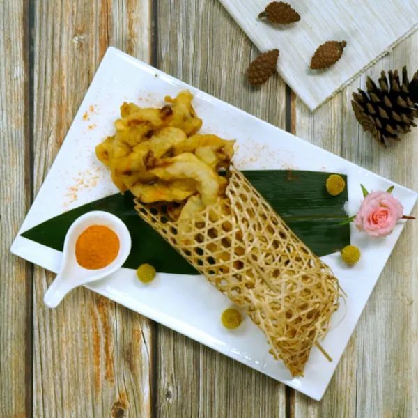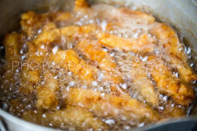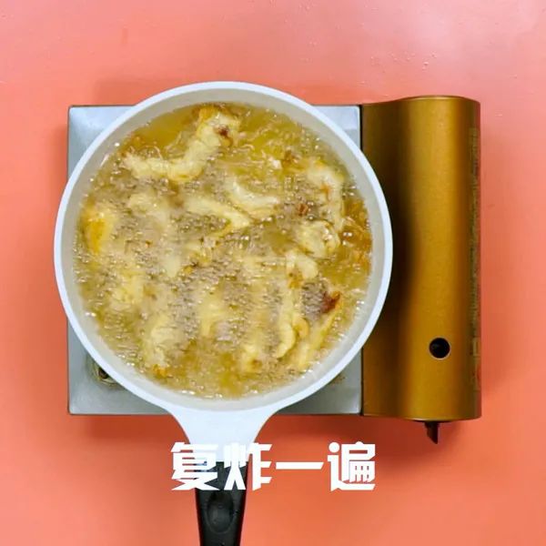 4.里脊裹上面糊,锅中油中火烧热,炸至金黄捞出,再复炸一次即可